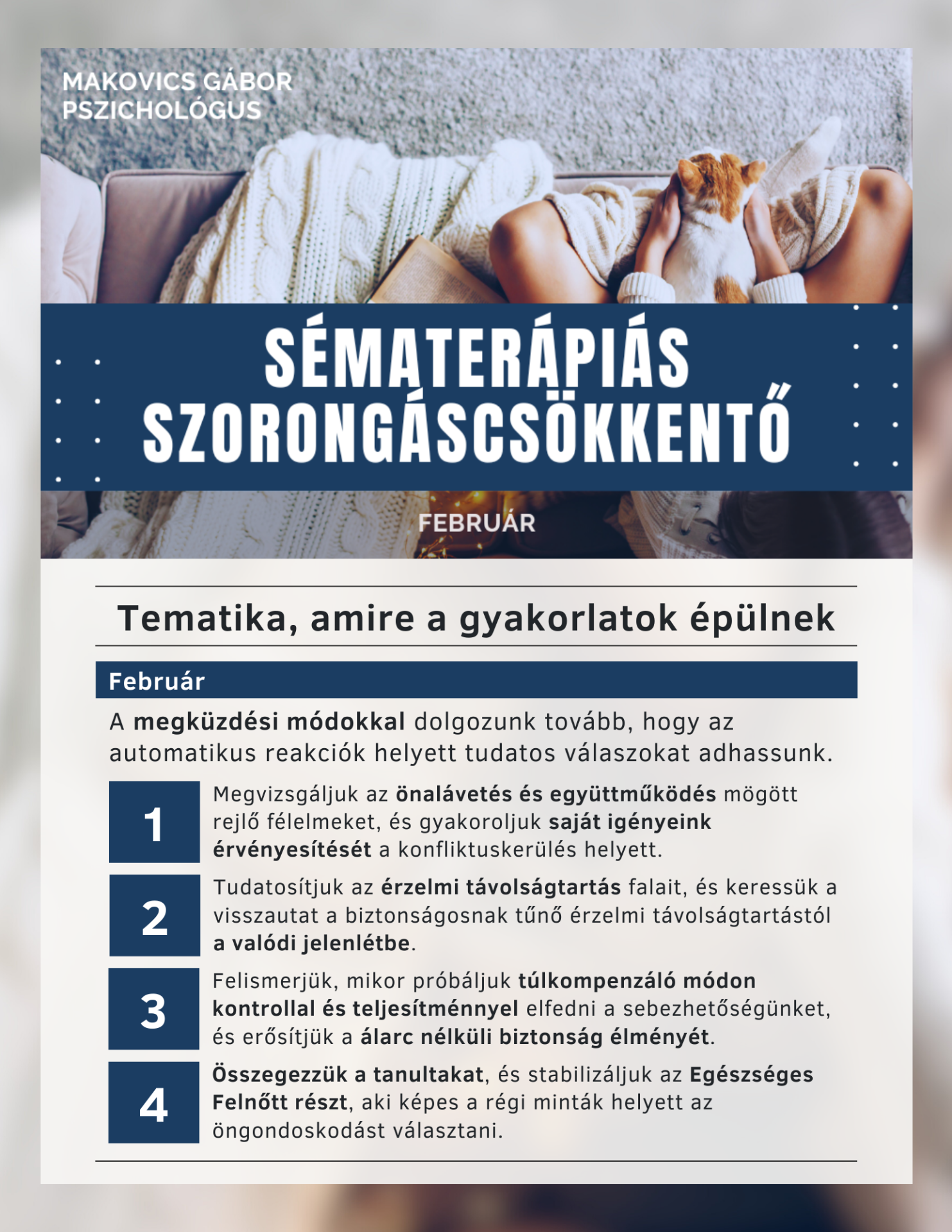 Február: Sémamódok a fókuszban II. – A megküzdési stratégiák hálójában A januári fogadalmak heve már alábbhagyott, és februárra gyakran visszaköszönnek a hétköznapok nehézségei. Ilyenkor válik igazán láthatóvá, hogyan próbáljuk "túlélni" a feszültséget: sokszor automatikus, régi maladaptív megküzdési módokba menekülünk, amelyek bár rövid távon védenek, hosszú távon elszigetelnek minket a valódi szükségleteinktől. Ez a 4 hetes folytatás neked szól, ha... Túlkompenzálsz: Úgy érzed, állandóan bizonyítanod kell, vagy támadással válaszolsz, ha sebezhetőnek érzed magad. Elkerülsz: Inkább a munkába, a sorozatokba vagy az érzelmi elérhetetlenségbe menekülsz, csak ne kelljen szembenézned a nehéz érzésekkel (Leválasztott Védelmező mód). Önalávető vagy: Hajlamos vagy háttérbe szorítani a saját igényeidet mások kedvéért, csak hogy elkerüld a konfliktust. Erősítenéd az Egészséges Felnőttet: Szeretnéd tudatosan felismerni ezeket a "falakat", és valódi kapcsolódást kialakítani önmagaddal és másokkal. Mi történik a Sémamódok II. programban? Ebben a szakaszban a belső szülői hangok azonosítása után továbblépünk a cselekvő mintákra . Megvizsgáljuk azokat a maladaptív megküzdési módokat, amelyekkel tudattalanul próbálod óvni a sebezhető Belső Gyermekedet, de amelyek valójában gátolják a fejlődésedet. Lépésről lépésre kapsz gyakorlati eszközöket ahhoz, hogy: Felismerd a pillanatot, amikor bekapcsol a tanult megküzdési mechanizmus. Lebontsd azokat a falakat, amelyek már nem szolgálnak téged. Tudatosítsd az Egészséges Felnőtt módot, aki képes az öngondoskodásra és a valódi érzelmi jelenlétre. Ez a folyamat nem a tünetek elnyomásáról szól, hanem arról, hogy az Egészséges Felnőtt szemével tanulj meg ránézni a saját védelmi vonalaidra, és képessé válj a valódi, rugalmas válaszreakciókra.