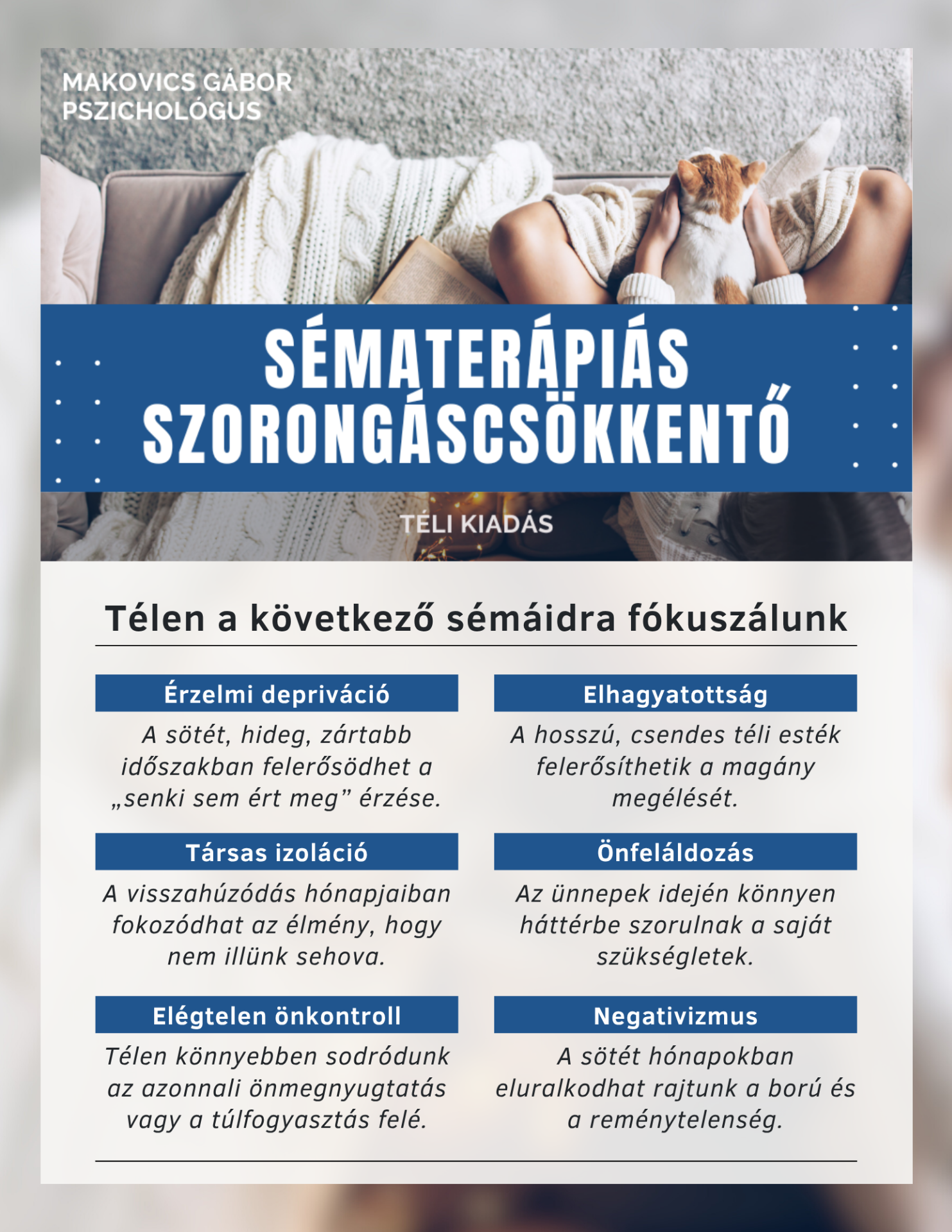 Ez egy sématerápiás szemléletben felépített, gyakorlatorientált kurzus, amely segít megérteni, miért erősödnek fel télen ezek a belső mintáid, és hogyan tudsz lépésről lépésre visszatalálni a nyugalomhoz, a melegséghez és a belső egyensúlyhoz.