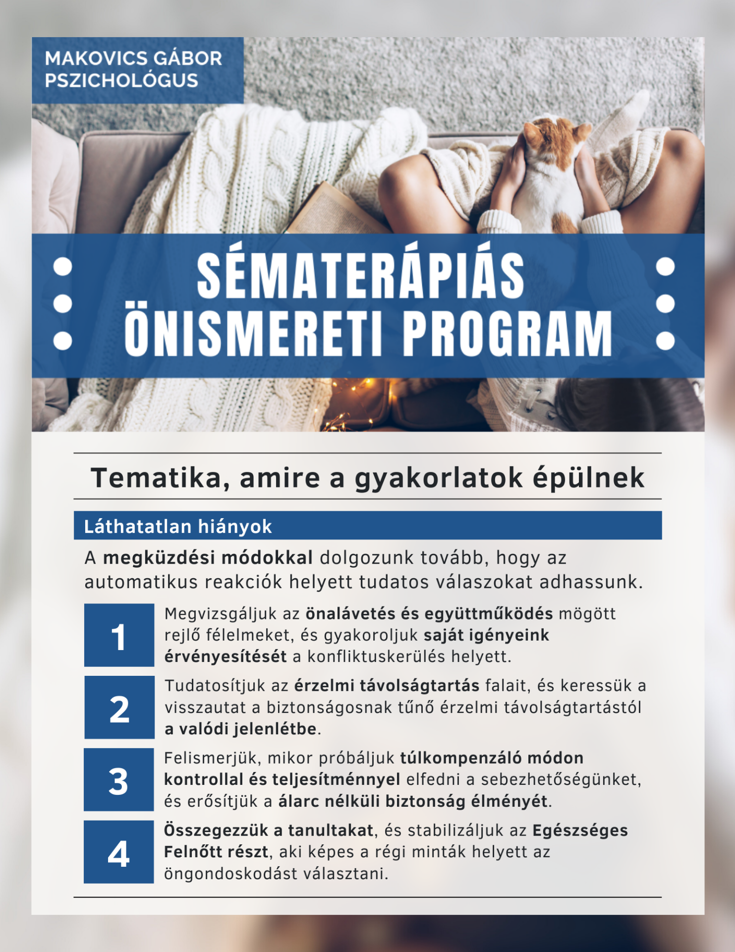 Ez egy sématerápiás szemléletben felépített, gyakorlatorientált kurzus, amely segít megérteni, miért erősödnek fel télen ezek a belső mintáid, és hogyan tudsz lépésről lépésre visszatalálni a nyugalomhoz, a melegséghez és a belső egyensúlyhoz.