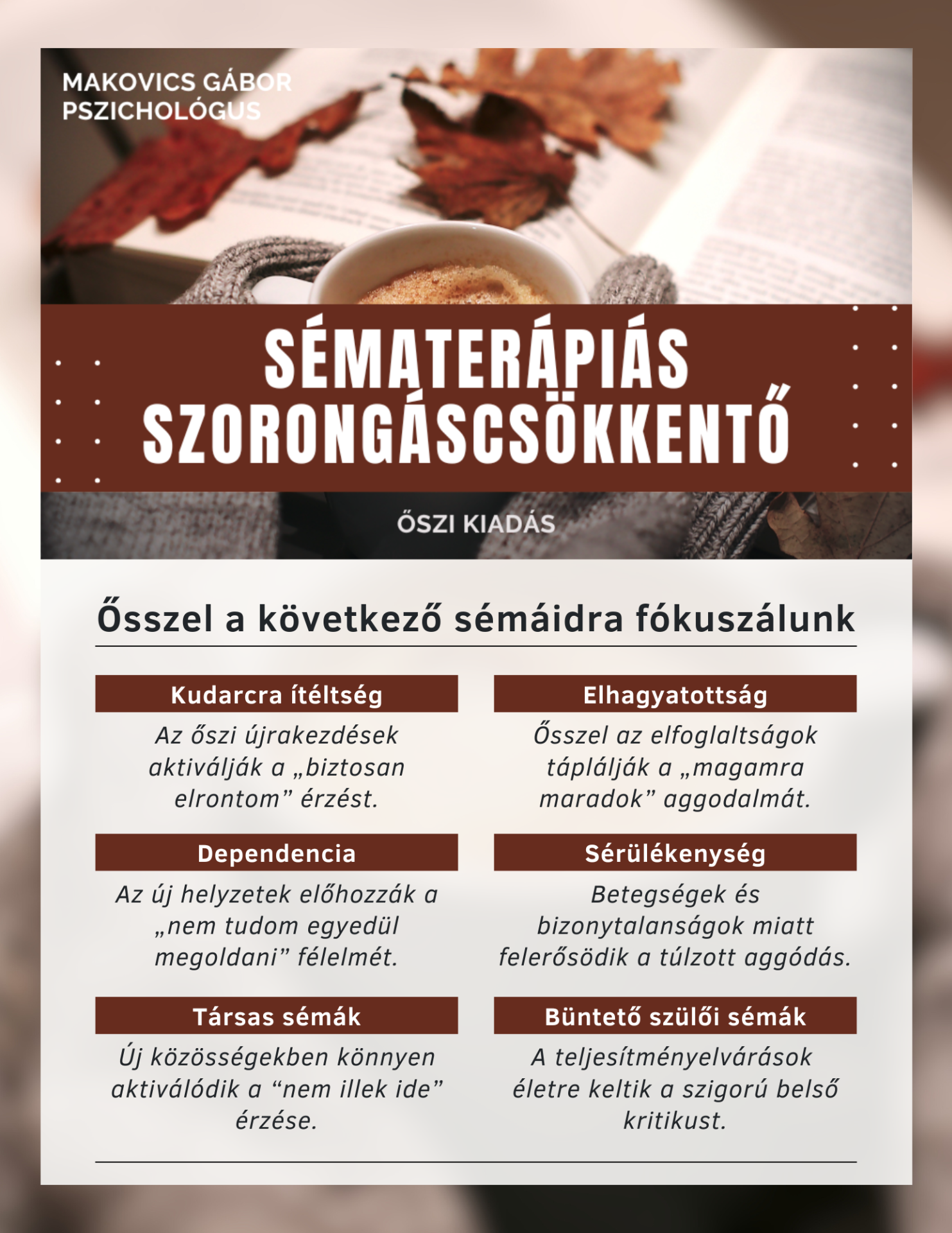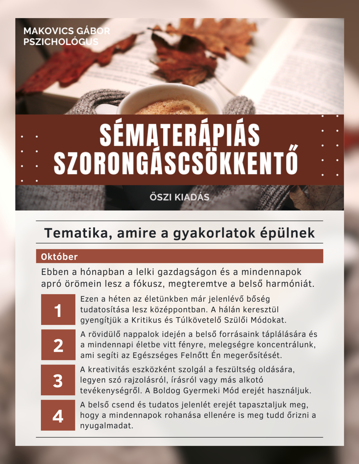 A hónap lezárása után pedig bármikor folytathatod a novemberi programmal, így folyamatosan építheted tovább a sémás gyakorlati tudásodat a szorongáscsökkentés terén.